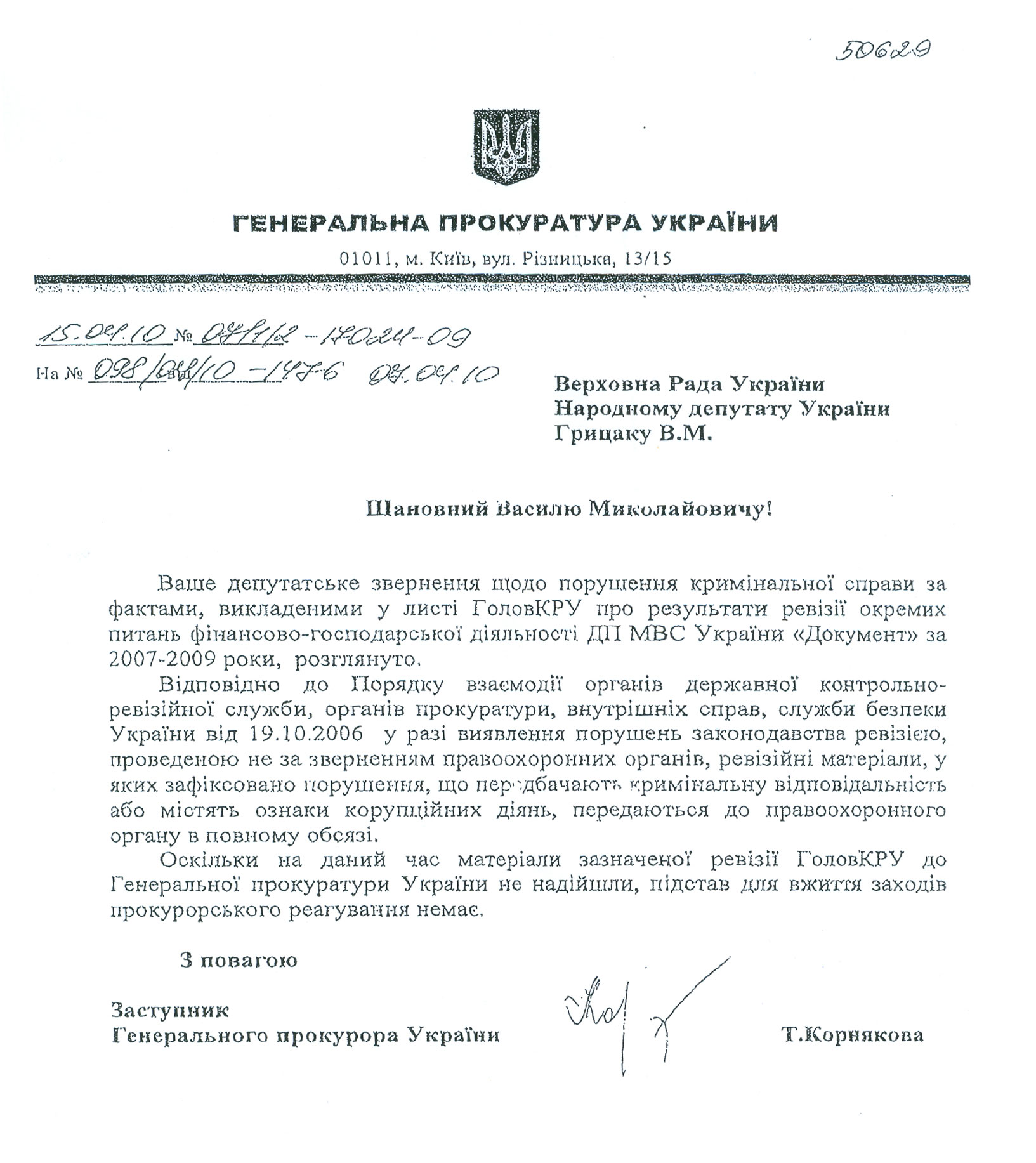 Тот факт, что документы с результатами проверки «не дошли» до Генеральной прокуратуры свидетельствует письмо заместителя Генерального прокурора Украины Татьяна Корняковой (см. ниже фото документа).