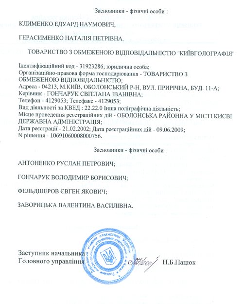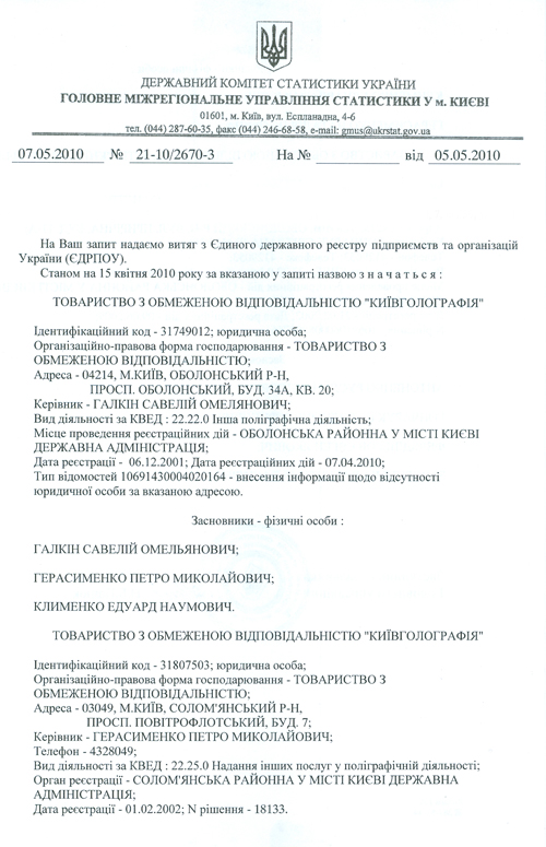 Кстати, обращает на себя внимание тот факт, что в справке Госкомстата указано аж ТРИ ООО «Киевголография». При этом зарегистрированы клоны на разных людей. Вполне может статься, что это четко продуманная мошенническая схема, чтобы в случае чего можно было быстро спрятать «концы в воду». Ну, например, работает одно ООО «Киевголография» с государством, а оборудование числиться на другом. Чего-то не сложилось, заказ в сроки не выполнен, госденьги потрачены (разворованы!?) – фирма, работающая с государством, тут же безболезненно ликвидируется. Иди, ищи ветра в поле.