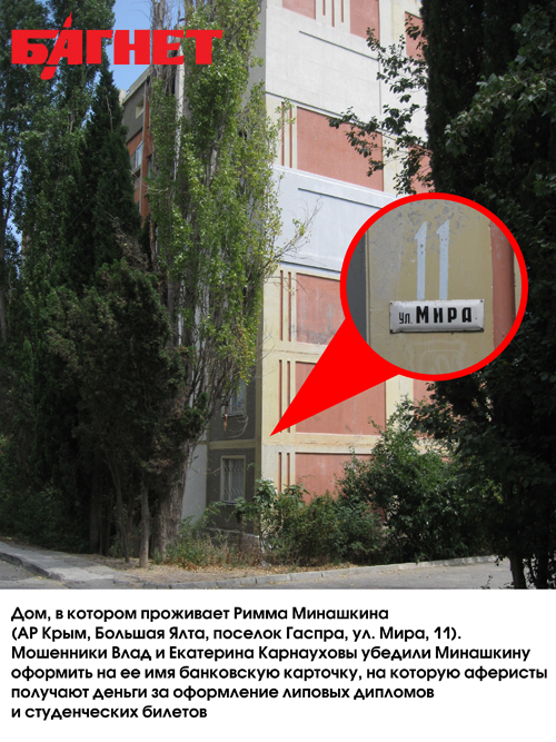 Например, в Большой Ялте в поселке Гаспра проживает некая гражданка Минашкина Римма Алексеевна, на карточный банковский счет которой поступают деньги за фальшивые дипломы.