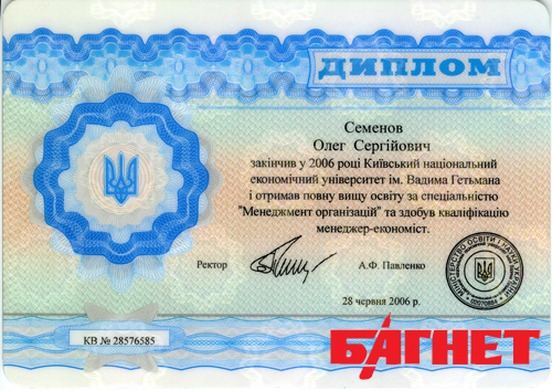 Третий диплом – диплом специалиста Киевского национального экономического университета, выписанный на Семенова Олега Сергеевича, под номером КВ № 28576585.