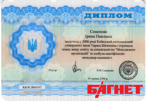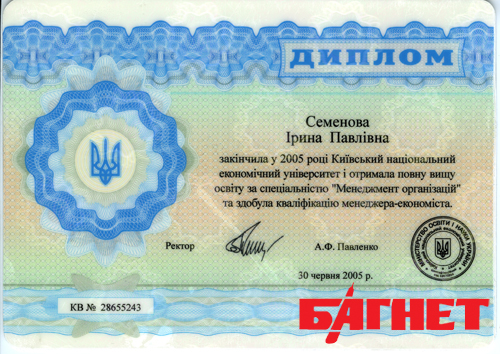 Первый купленный диплом – диплом специалиста Киевского национального экономического университета, выписанный на Семенову Ирину Павловну (фамилия вымышленная), под номером КВ №28655243 изготовлен на оригинальном бланке.