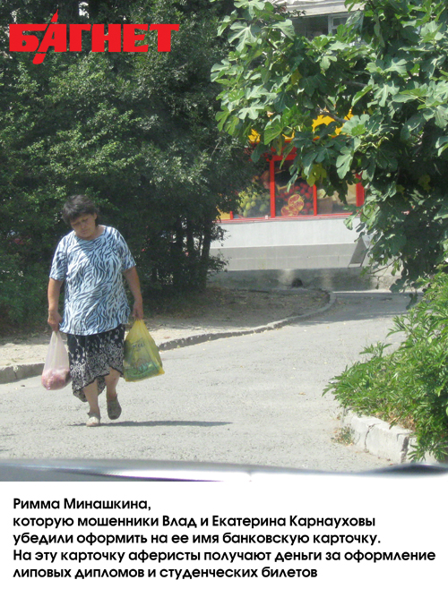 Вначале банковская карточка находилась у самой Минашкиной. Когда на ее счет поступали деньги за фальшивые дипломы, она, свято веруя в то, что это средства за съем-сдачу квартир, самостоятельно ходила в банк и снимала средства, забирая себе 20 гривен с каждого платежа. Впоследствии Карнауховы убедили Минашкину отдать им карточку – мол, ей не стоит тревожиться, они сами будут снимать деньги, и по-прежнему будут отдавать Минашкиной ее проценты.