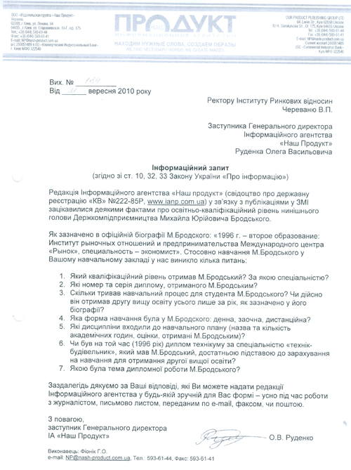 Коллеги из информагентства «Наш продукт» решили узнать, в каких таких университетах и чему обучался человек, демонстрирующий столь вопиющее невежество в законодательстве (которое, к слову, систематически и в открытую нарушает) и управлении, что диву даешься. Журналисты направили ректору учебного заведения, где учился Бродский, официальный информзапрос, содержащий вполне конкретные вопросы относительно учебы, специальности, и квалификации студента Михаила. Справедливости ради стоит отметить, что, имея таких позорных выпускников, любой ВУЗ должен всерьез задуматься о самоликвидации. Итак, журналисты решили задать ректору заведения, в котором якобы учился Бродский, несколько вопросов, ответы на которые должны были внести ясность – есть ли у Михаила достаточный для работы на высоком посту уровень образования.