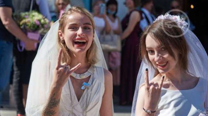 Под стенами ЗАГСа инсценировали свадьбу двух девушек с хором, шампанским и лепестками роз.