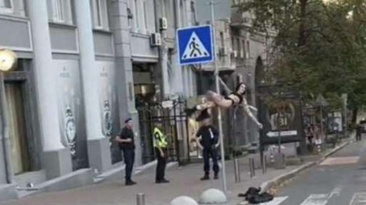 В Киеве полуобнаженная девушка танцевала стриптиз на дорожном знаке. Видео опубликовал Telegram-канал KIEVMAP.