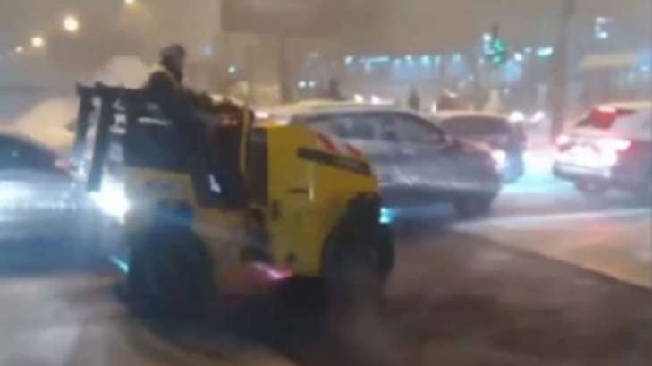 На кадрах записи видно, как во время снегопада каток утрамбовывает уложенный асфальт.