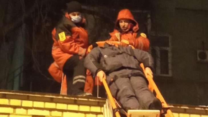 Приехавшие забирать его спасатели уронили носилки с ним с высоты больше человеческого роста. Фото случившегося опубликовала в "Фейсбуке" пресс-служба КАРС "Киевская служба спасения".