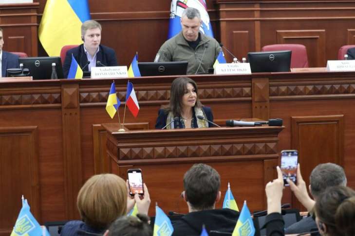 "Мэр Парижа Анн Идальго выступает в сессионном зале Киевсовета. Она во второй раз за время полномасштабной войны посещает столицу Украины. Делегация прибыла с помощью – передали нашему городу 10 генераторов", – сообщил Виталий Кличко.