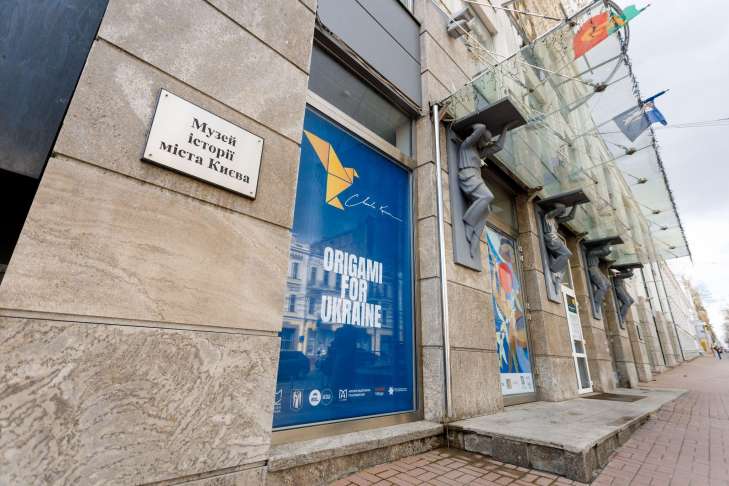 9 квітня на фасаді Музею історії міста Києва з’явилася масштабна артінсталяція ORIGAMI for UKRAINE — композиція з 5000 орігамі-птахів, створених із металізованого паперу.