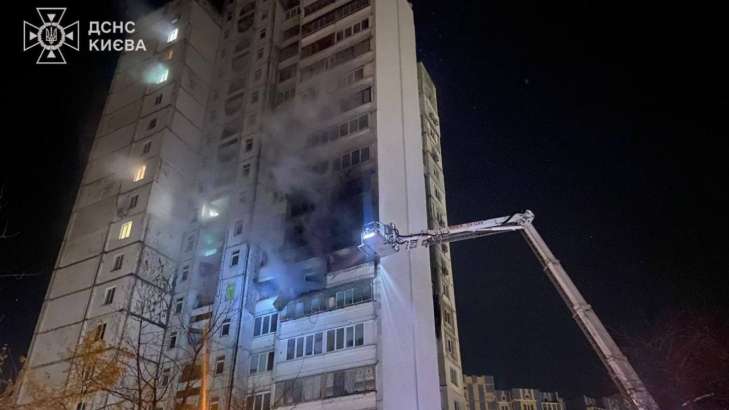 В Оболонському районі — влучання у 9-поверховий житловий будинок, внаслідок чого виникло загоряння квартир з 7 по 9 поверхи на загальній площі близько 100 кв. м. Одну людину врятовано, пожежу ліквідовано.