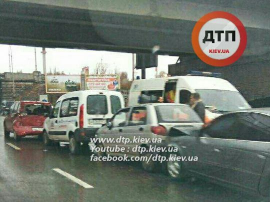Как сообщает корреспондент dtp.kiev.ua, ДТП с участием сразу 4 авто произошло в Киеве на Надднепрянском шоссе сегодня днем, 14.12.2015.