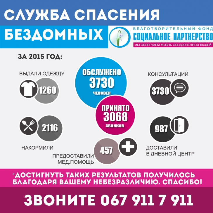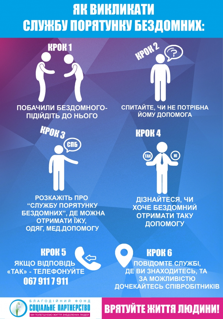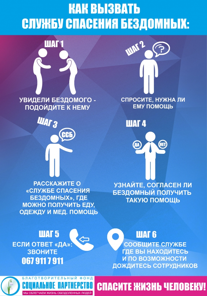 Если вы увидели на улице бездомного, который нуждается в помощи, то вызовите службу по номеру 067-911-7-911. График работы: 9:00 - 21:00.