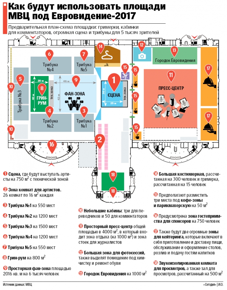 ПЛОЩАДКА. Пока договор МВЦ с организаторами Евровидения-2017 не подписан. Это ожидается в ближайшее время. "Мы готовы к конкурсу, нужно только усовершенствовать систему вентиляции — достраивать и пристраивать ничего не придется. Разработали предварительный план-схему размещения самого конкурса (см. инфографику). Но это лишь предварительные наброски, которые готовились как заявка на принятие конкурса в Киеве. Все еще будет много раз меняться, и окончательно, где и как все разместится в комплексе, будет известно позже. Мы ждем рекомендаций от организаторов конкурса и выполним все их требования", — говорят в МВЦ.
