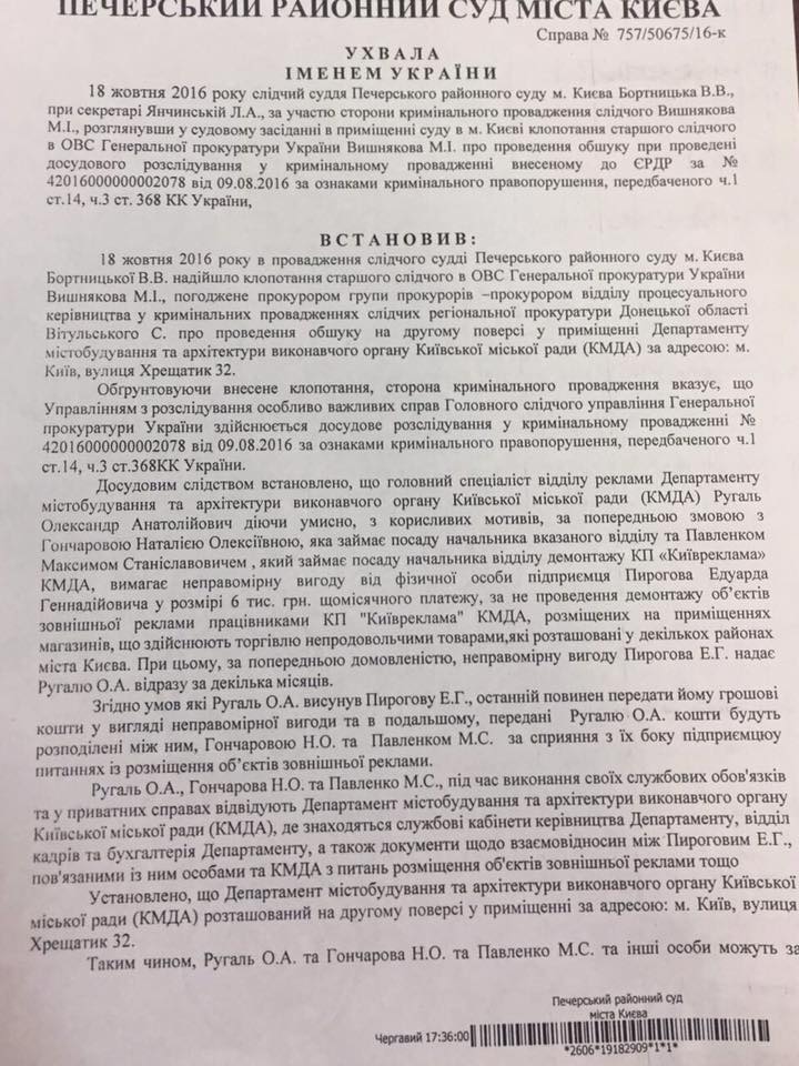 Про це йдеться в ухвалі Печерського районного суду у місті Києві №757/50675/16к, копія якого з’явилася у мережі. З документи випливає, що саме за дорученням начальника відділу реклами ДМА Наталії Гончарової один з її підлеглих вимагав регулярні щомісячні хабарі від підприємців. За таку “абонплату” чиновниця надавала сприяння в оформленні дозволів на розміщення вивісок та рекламних конструкцій та закривала очі на порушення з боку підприємців.