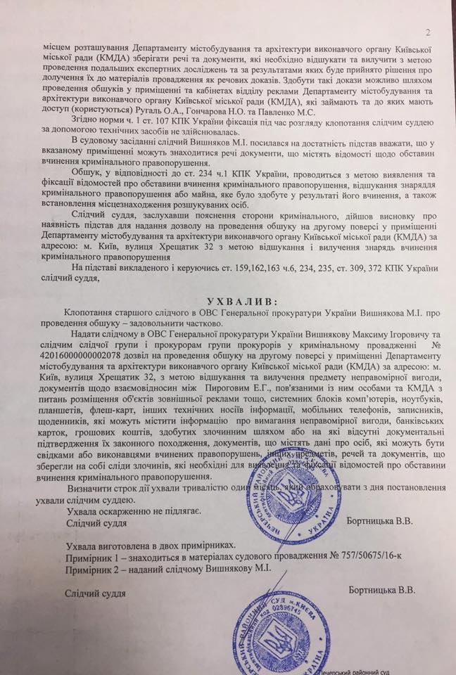 Ухвалою суд дозволив провести обшуки у приміщення відділу реклами ДМА за адресою Хрещатик 32. Провадження порушено за ознаками злочину передбаченого ч.3 ст.368 Кримінального Кодексу України. Стаття передбачає злочин одержання неправомірної вигоди службовою особою за дії вчинені в інтересах третьої особи. Частина третя передбачає отримання неправомірної вигоди у великих розмірах, особою що займає відповідальне становище і вчинення злочину за попередньою змовою групи осіб. Згідно ККУ за такий злочин передбачено покарання терміном від 5 до 10 років ув’язнення.