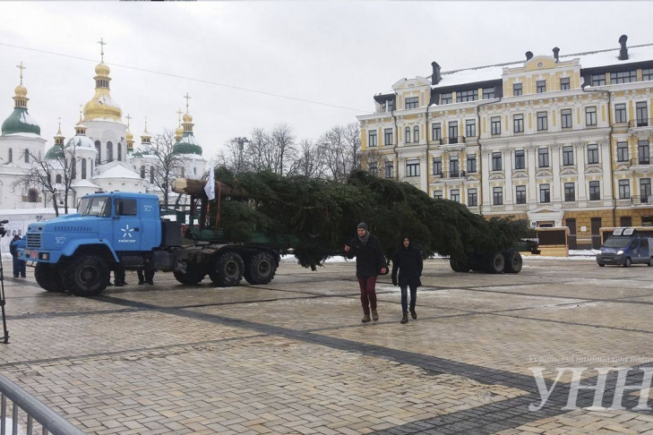 На Софиевскую площадь Киева привезли главную елку Украины, сообщает 112.