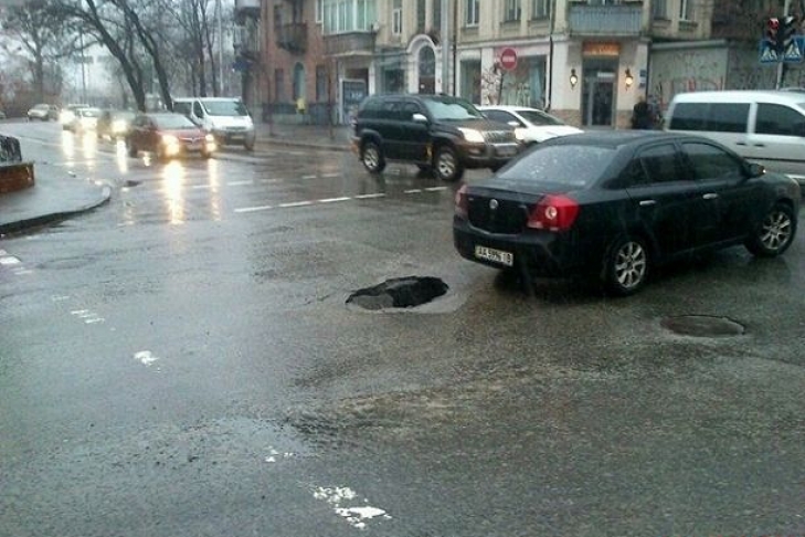 В Киеве на пересечении улиц Жилянской и Тарасовской образовалась яма на проезжей части.