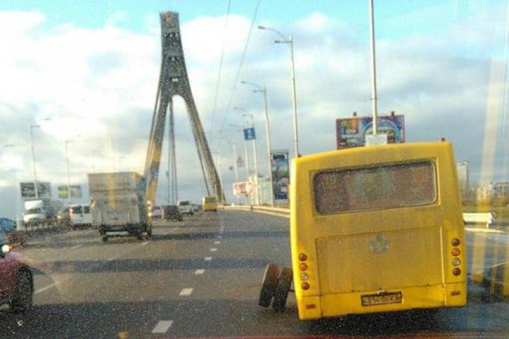 В Киеве на Московском мосту на остановке "Парк Дружбы народов" произошло ЧП. У маршрутки, едущей в сторону Петровки, отвалилось заднее левое колесо. Фотография маршрутки выложена в сообществе "Типичный Киевпасстранс" Вконтакте, передает "Сегодня".