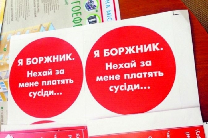 Всего было обнаружено два вида наклеек. На одних текст: "Я должник. Пусть за меня платят соседи". На других угроза: "На ваше помещение наложен арест! Немедленно оплатите задолженность за жилищно-коммунальные услуги, иначе, в соответствии со ст. 62 Закона Украины "Об исполнительном производстве", ваше имущество будет реализовано на аукционе в счет погашения задолженности".