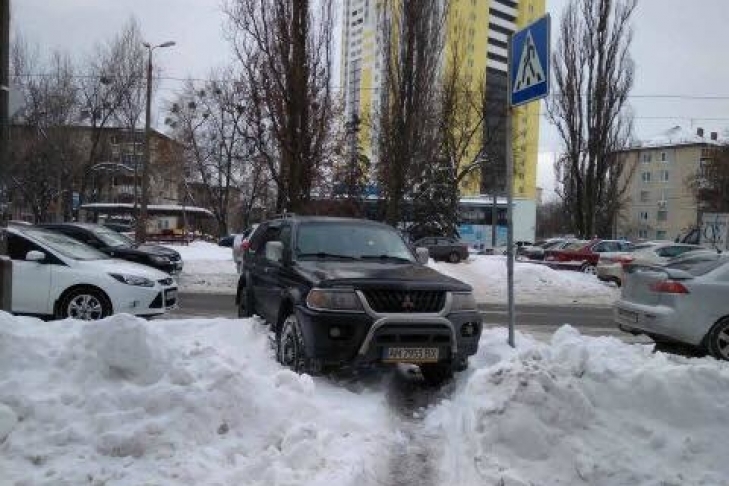 В Соломенском районе Киева прохожие заметили автомобиль Mitsubishi Pajero, водитель которого припарковался возле зебры на расчищенной от снега дорожке.