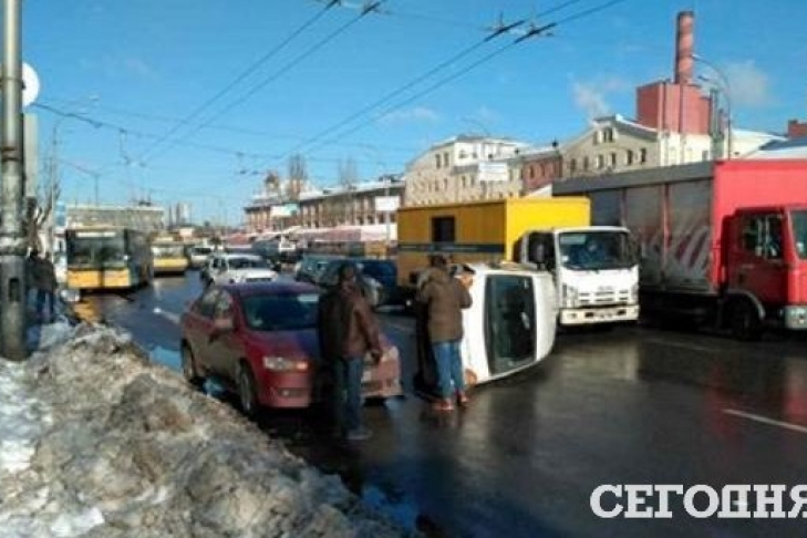 Сегодня, 15 февраля, в Киеве на проспекте Науки рядом с Демеевской площадью в результате ДТП опрокинулся автомобиль Fiat.