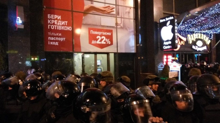 На Крещатике противники разгона блокады закидали камнями офис и начали громить отделение банка (ФОТО)