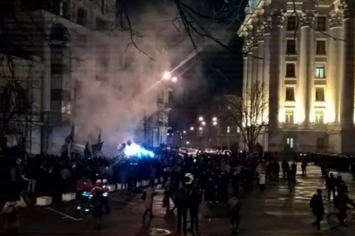 Кроме того сообщается, что протестующие поднялись до Михайловского собора и начали забрасывать камнями и петардами окна одного из офисов, расположенного напротив здания МИД Украины.