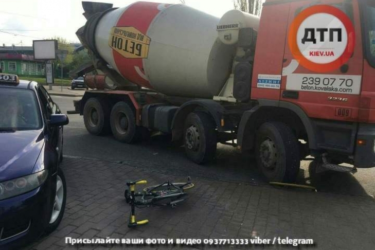 Авария произошла в столице 5-го апреля на Большой Васильковской, 114. Бетоновоз не пропустил девушку на Сannondale, едущую по главной дороге, и сбил молодую киевлянку.