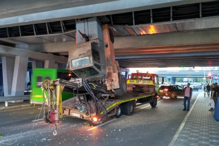 Эвакуатор протаранил отремонтированный мост возле станции метро "Левобережная"