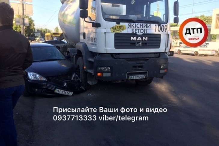 Там произошло столкновение Мицубиши и бетоновоза. К счастью, обошлось без пострадавших, хотя легковушка получила сильные повреждения.