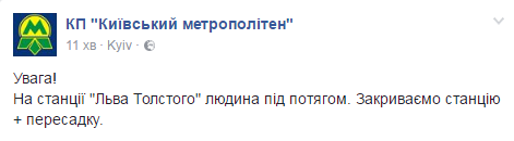 "На станции "Льва Толстого" человек под поездом. Закрываем станцию + пересадку", - говорится в сообщении.