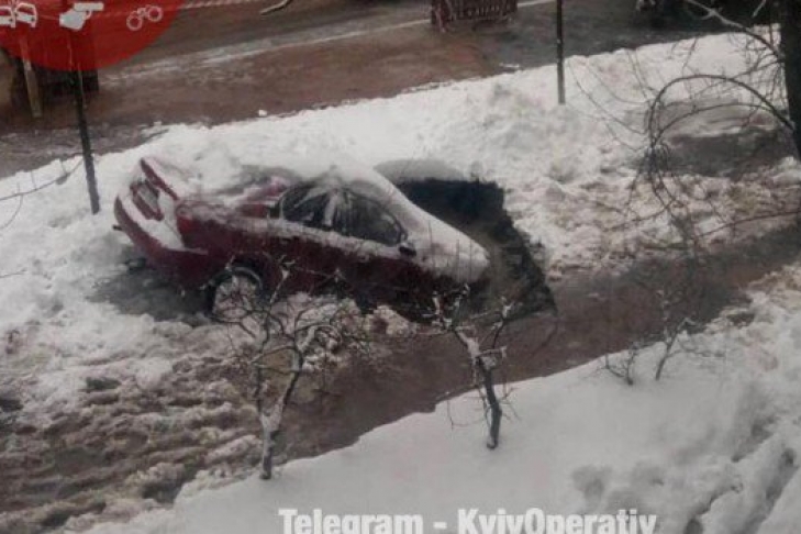 В Киеве прорвало трубу и затопило ул. Ольжича, после этого возле места прорыва припаркованный автомобиль наполовину провалился под землю. Об этом сообщает 112.