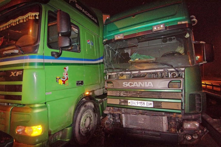 Как сообщается, авария произошла сегодня, 14 марта, около 3 часов. Грузовик DAF двигался по средней полосе. Его подрезал легковой автомобиль. Водитель резко затормозил, чтобы избежать столкновения. В результате в тормозящую фуру врезался другой большегруз Scania.