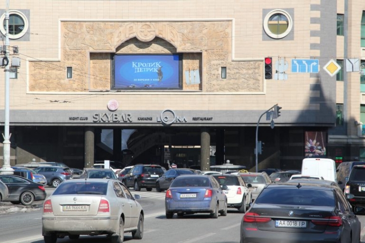 Экран размещен на фасаде торгово-офисного центра, который выходит в сторону пл. Льва Толстого и прекрасно обозревается из огромных автомобильных и пешеходных потоков.