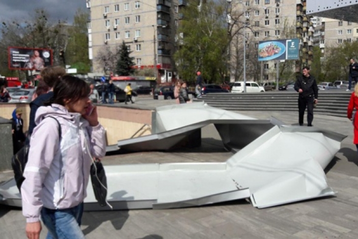 По информации, металлическая конструкция упала на пешеходов и подземный переход. От удара пострадала бабушка, которая проходила мимо.