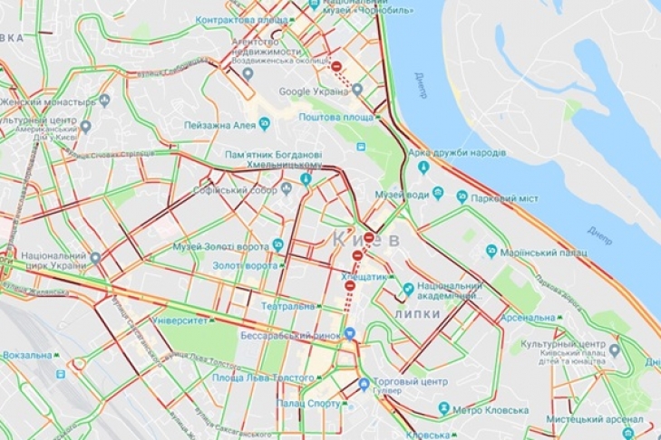Центр Киева в четверг, 17 мая, парализовали пробки. Об этом свидетельствуют данные сервиса Google.