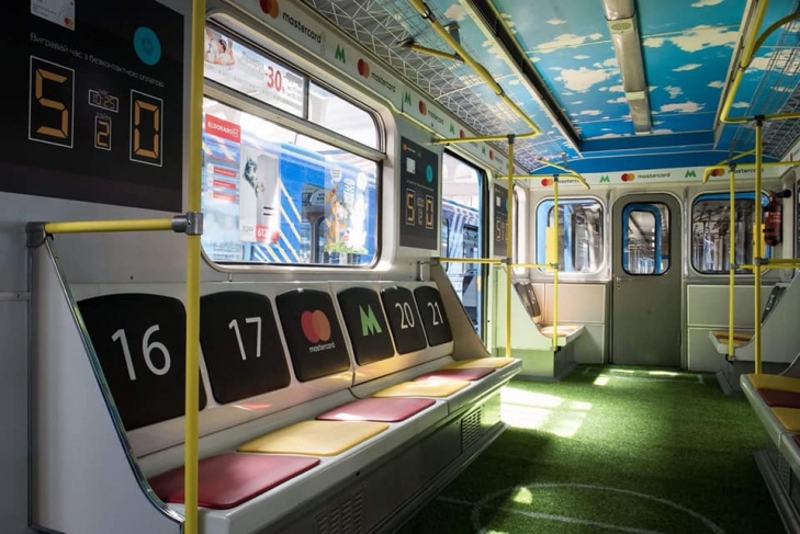 Внутри вагон стилизирован под футбольное поле - с зеленым полом и разметкой. Сиденья тоже стилизировали - на спинках нанесены "номера игроков".