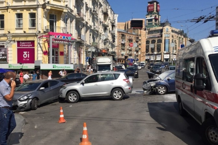 По информации издания, автомобиль "Хюндай" ехал со стороны Бессарабской площади и поворачивал на ул. Эспланадную. И в этот момент в него врезался кроссовер "Тойота", в который, в свою очередь, врезался "Фольксваген".