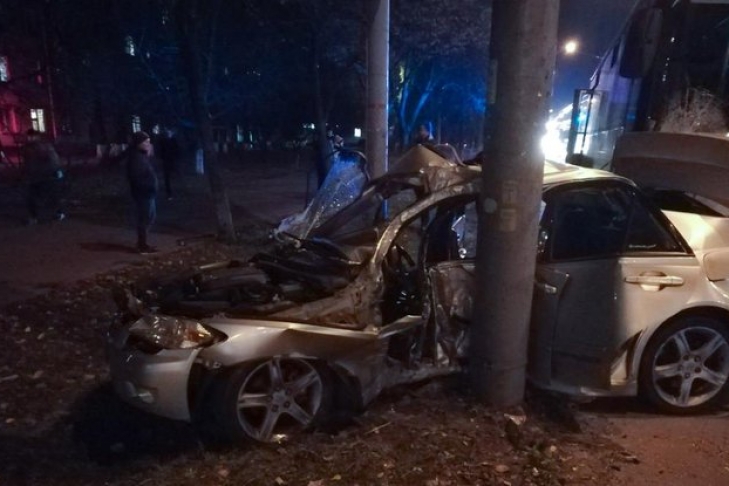Lexus ехал в крайнем левом ряду и резко начал перестраиваться в соседний, прямо перед автобусом. "Богдан" не успел притормозить, вследствие чего произошло столкновение. Легковушка влетела в столб, а в нее - автобус.