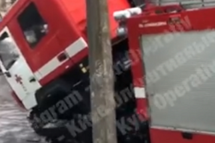 В Киеве под асфальт провалилась пожарная машина (видео)