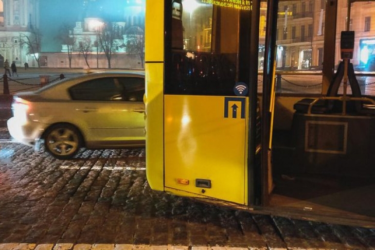 Возле ГУ Национальной полиции Киевской области мужчину зажало между троллейбусом и легковым автомобилем, сообщает "Информатор".