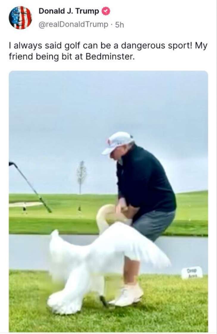 Президент США Дональд Трамп опублікував фотографію свого спецпосланця Стіва Віткоффа, якого під час гри в гольф вкусив лебідь. Знімок президент розмістив у своїй соціальній мережі Truth Social, повідомляє Associated Press