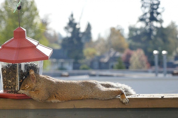 Белка нашла источник быстрого питания — кормушку для птиц, в которой «победно» уснула сразу после обеда, пишет Mashable.