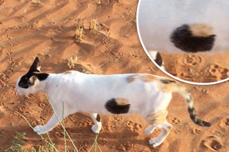 На фотографии, сделанной в пустыне, пятно создает иллюзию, что кот виден насквозь, так как его имбирный цвет сочетается с цветом песка. Оптический обман также создается благодаря черной галочке, которая тянется по всему краю пятна, образуя полое кольцо.