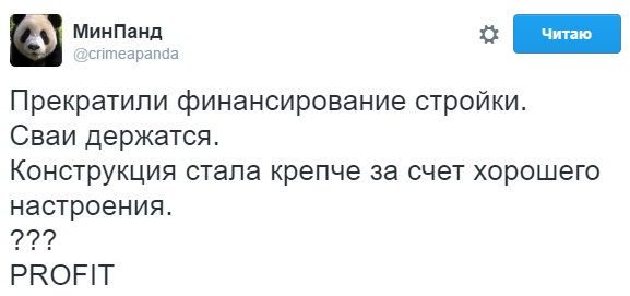 Прекращение финансирования строительства Керченского моста из России в аннексированный Крым бурно обсуждается в соцсетях. Блогеры отмечают пафосные заявления властей РФ о строительстве моста, а также суровую реальность, с которой эти заявления столкнулись. "Апостроф" собрал самые интересные, по нашему мнению, комментарии.