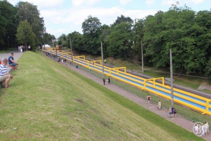 Сорвать развлечения угрожали люди, которые протестовали против декоммунизации. Гигантская водная горка, длиной с три футбольных поля, спасает Чернигов от жары.