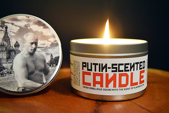 Свеча с изображением главы РФ соединила запахи сосны, земли и дыма. Как отмечается в сообщении, "этот аромат создан для того, чтобы устранить запах политических диссидентов в вашем доме".