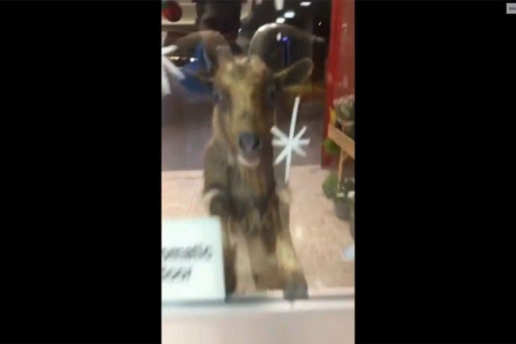 На опубликованных ниже кадрах запечатлено, как козел ломится в дверь магазина. По словам владельца помещения, парнокопытный хулиган начал бодать все вокруг, когда понял, что внутрь ему не попасть.