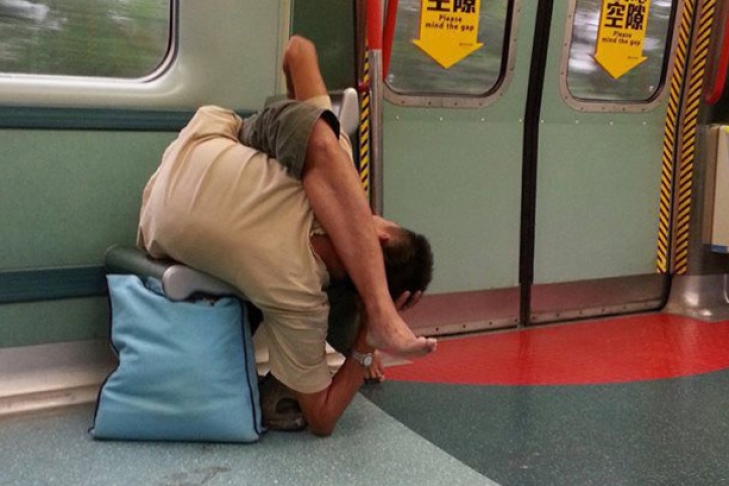Пассажиры гонконгского метро пришли в шок, увидев, как один из соседей по вагону сидит, закинув ногу за спину. Фотографии мужчины с удивительной растяжкой разлетелись по Сети. Многие отметили, что видели этого "йога" в поездах, однако его имя и мотивация до сих пор неизвестны, сообщает Mashable.