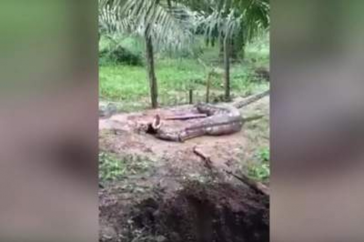 В Малайзии питон стал жертвой собственной жадности и прожорливости. Жители одной из деревень штата Паханг увидели утром, как у загона для скота лежит гигантская змея. Однако рептилия не пыталась сбежать. Об этом сообщает "Комсомольская Правда".
